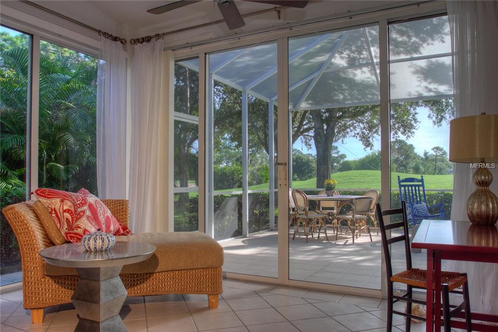 Beautiful decorating in this large villa with expansive views over the University Park golf course. All tile floors and large screened lanai overlooking the greens and sand trap. High end decorating in all the rooms, all tastefully coordinated. The villa has a king sized bed in the master bedroom, in the second bedroom there are two twin sized beds, then in the office/den there is a couch with a queen sized fold out bed. Off the kitchen there is a barbeque patio for ease of entertaining. The detached garage features installed cabinets for extra storage. Great location for your vacation on the exquisite golf course of University Park. UNIVERSITY PARK/ SEASONAL VILLA /SARASOTA/ BRADENTON FLORIDA